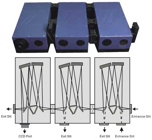 三级联光谱仪,由三台焦距为500mm 的“谱王”光谱仪经过特殊调校后组合而成,前两级谱仪作色散相减配置,主要作用是降低杂散光,后一级谱仪作色散相加配置,主要作用是提高分辨率。整台设计能够保证多种使用模式,既能分别作为单台光栅单色仪,也可以作为双联光栅单色仪使用。